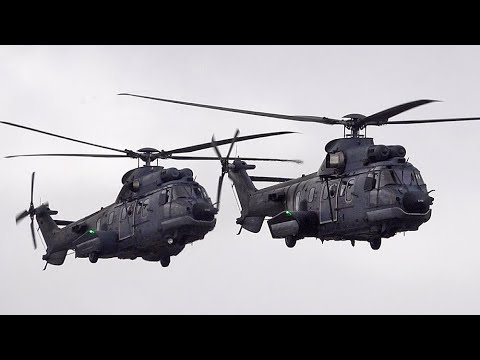 Two AS532 helicopters operated by the Royal Netherlands Air Force make a low pass over the runway at Stord airport (SRP/ENSO) in Norway.