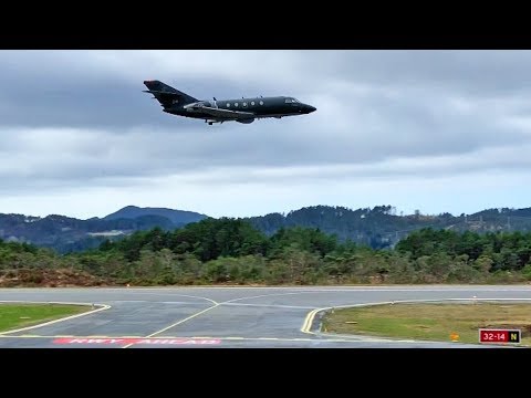A DA20 Falcon Jet from the Royal Norwegian Air Force performs a lowpass over the runway at Stord airport....